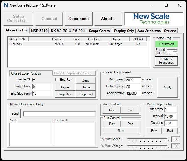 New Scale Pathway Software is a PC/Windows‑based control interface that allows users to operate, configure, and rapidly evaluate our M3 Motion Modules, SQUIGGLE motor controllers, and custom integrated motion systems. It supports a variety of miniature stages — including linear, rotary, and focus stages — as well as multi‑probe micromanipulator systems and the brand new DART™ Smart Linear Actuator.